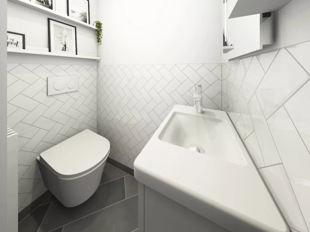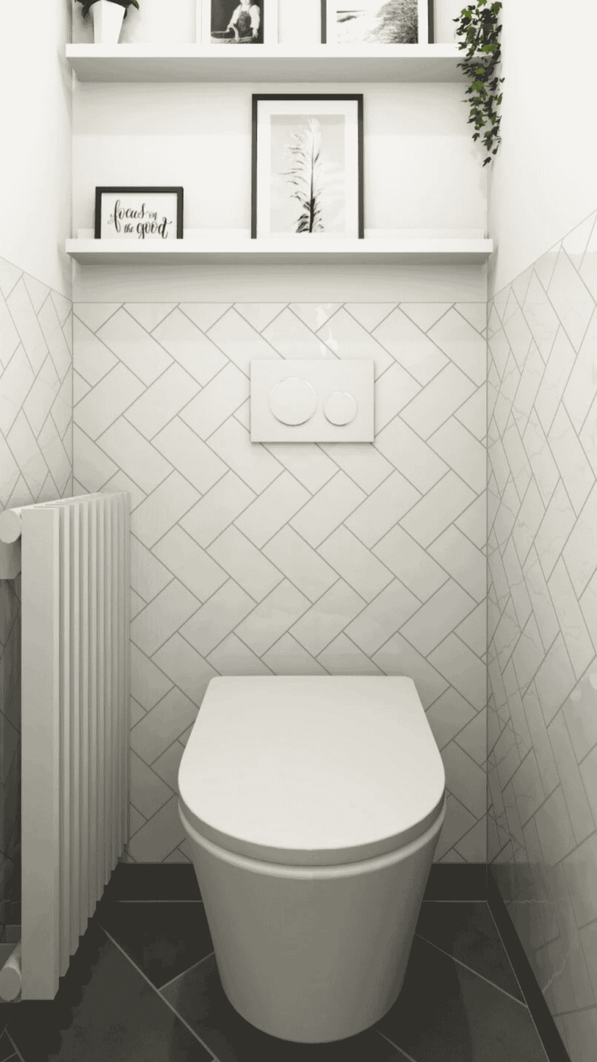 Nach der Renovierung: Das moderne Hänge-WC schafft mehr Bodenfreiheit und erleichtert die Reinigung. Helle Fliesen im Chevron-Muster setzen stilvolle Akzente.