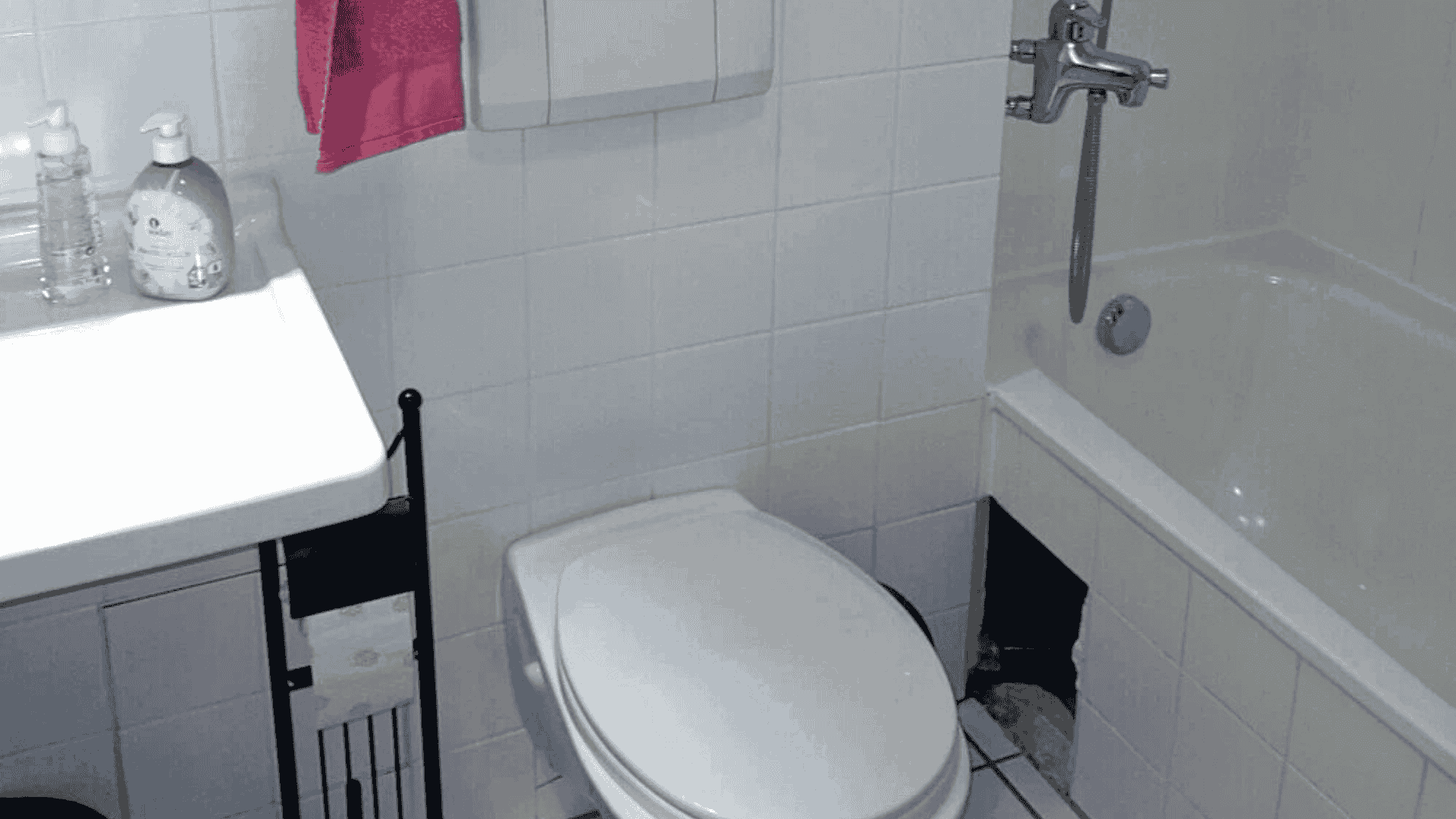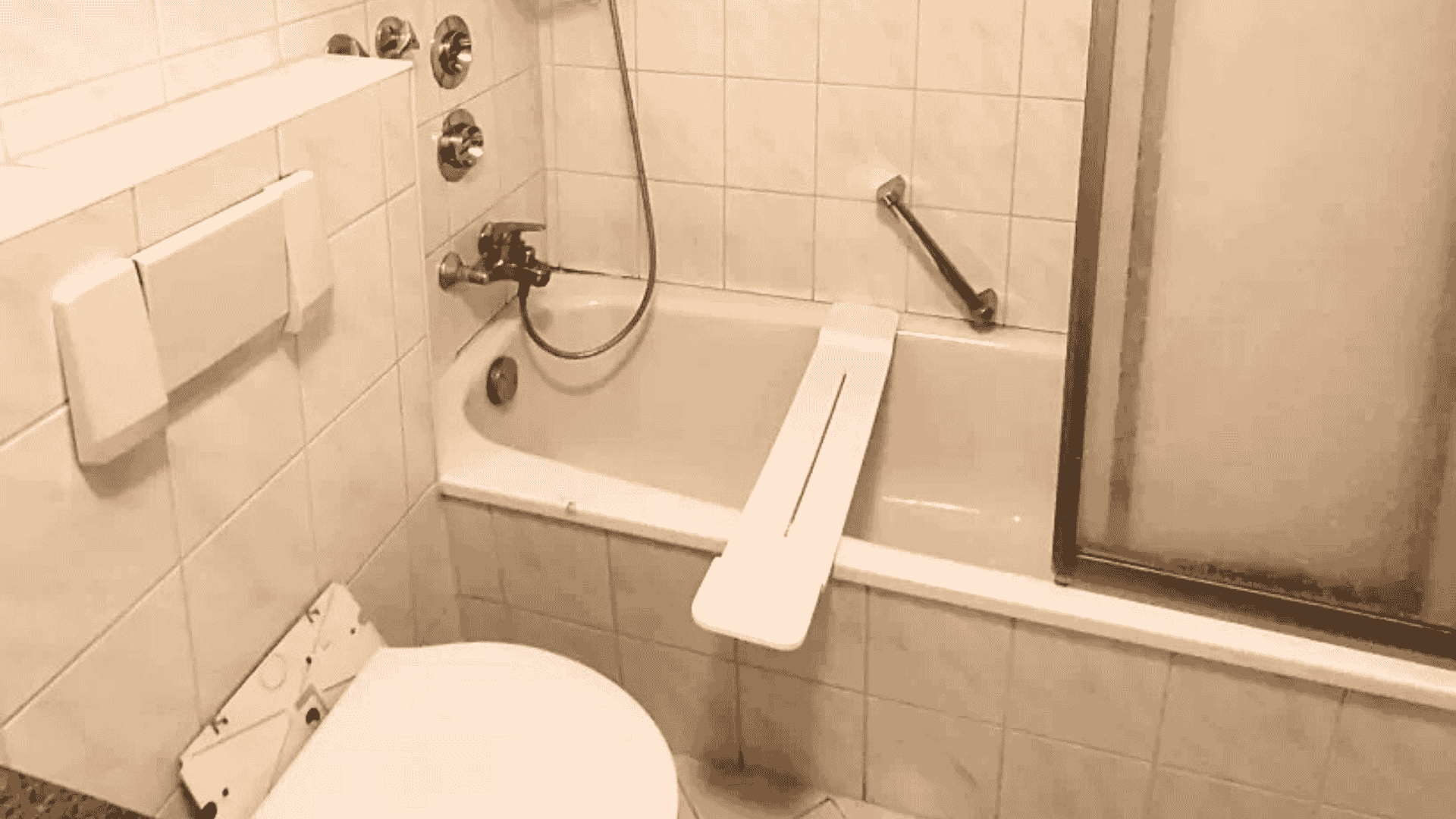 Bestand: Wanne mit klassischen quadratischen Fliesen, unbequeme Duschlösung für die Nutzer. Design veraltet.