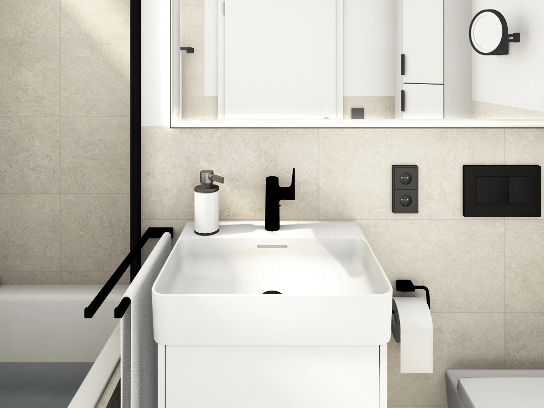 In diesem anspruchsvollen Projekt wurde ein Bad unter der Dachschräge neugestaltet. Die Herausforderung bestand darin, den begrenzten Raum optimal zu nutzen und gleichzeitig ein harmonisches Design zu schaffen. Ausgewählte Objekte, wie ein spezieller Waschtisch mit zwei Armaturen und ein beleuchteter Spiegel, wurden perfekt in die Schräge integriert.